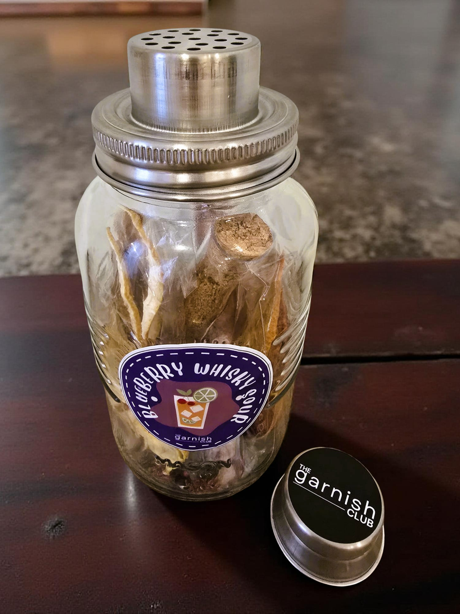Blueberry Whisky Sour Shaker Cocktail Kit by The Garnish Club, presented in a premium reusable 1L mason shaker glass jar — perfect for crafting rich, fruity whisky cocktails.